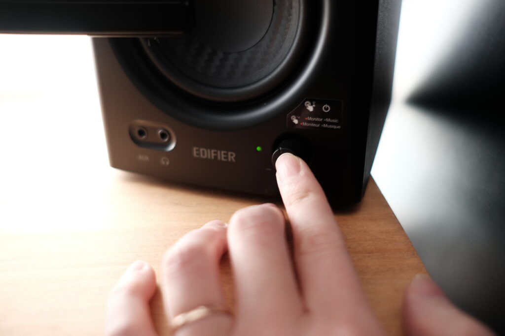 私はオーディオインターフェースで音量の調整をするので影響はないのですが、MR4の音量調整ノブは12段階しかありません。そのため、5と6の間くらいがちょうどいいんだよぉおおおとなっても調整できないので注意です。