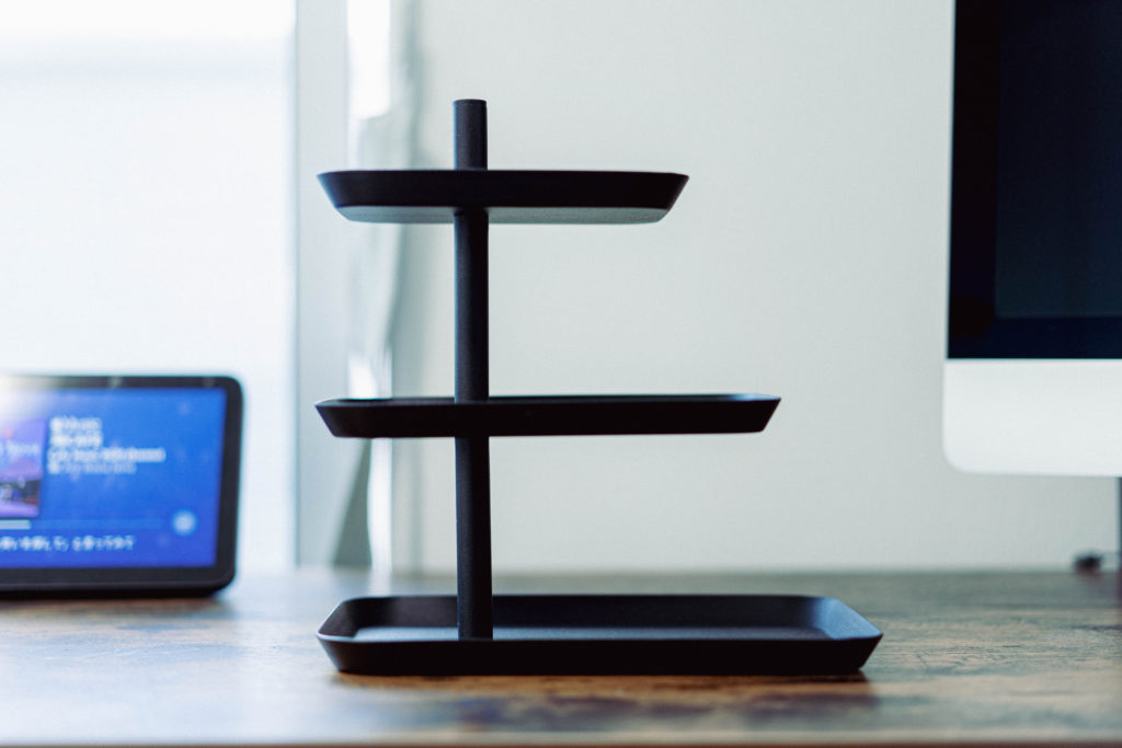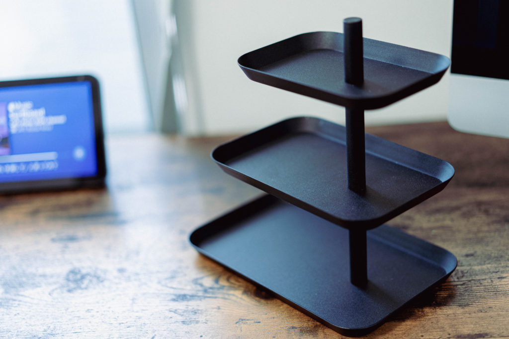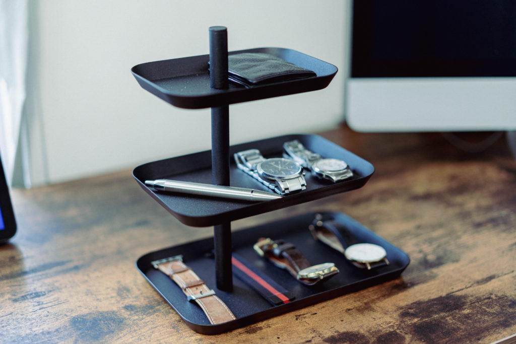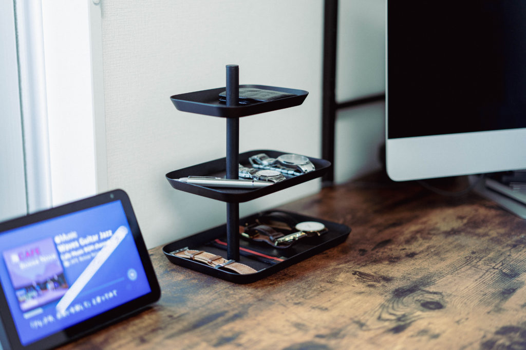 「アクセサリー 3段 トレー タワー」はマットな黒で引き締まって見えるので、時計やペンを置くだけで落ち着いた大人の空間を演出することができます。